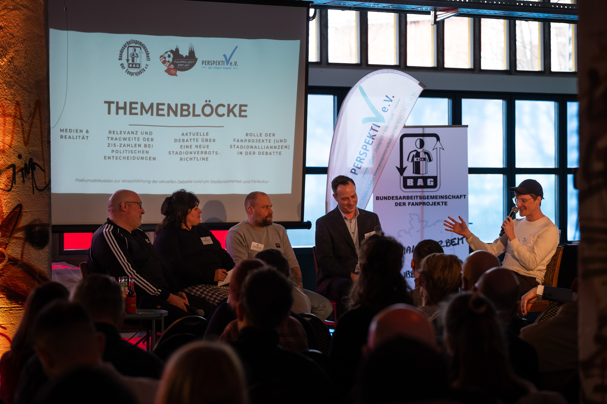 Ein zentraler Programmpunkt am Dienstag war die Podiumsdiskussion, die sich intensiv mit dem Spannungsfeld zwischen Stadionsicherheit und gelebter Fankultur auseinandersetzte. Neben unserem Mitarbeiter Christian Kabs diskutierten Michael Madre (Leiter der Zentralen Informationsstelle Sporteinsätze – ZIS), die Soziologin Stephanie Moldenhauer (Kofas – Kompetenzgruppe Fankulturen und sportbezogene Soziale Arbeit) sowie Thomas Kirschner (Sprecher der Fanbeauftragten der Vereine) über die aktuelle Lage in den Stadien.